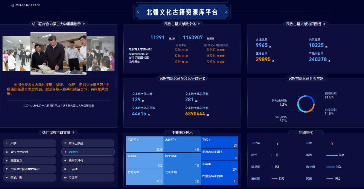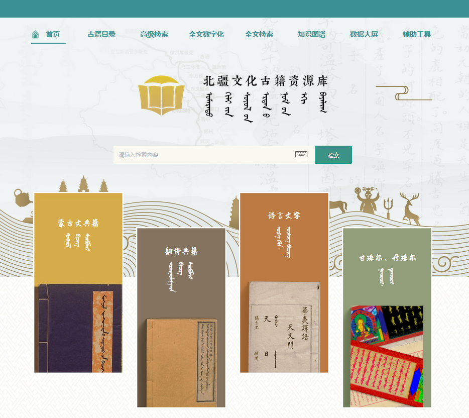 蒙古文智能信息处理技术国家地方联合工程研究中心组织了以飞龙教授为负责人的创新团队,攻克了古籍OCR、图像修复、知识图谱抽取等技术难题,成功开发了一整套蒙古文古籍数字化系统,建成一个数字化存储蒙古文古籍文献最多、检索分析智能化程度最高的 “北疆文化古籍资源库平台”(网址:http://bjwhgj.cn)。该平台包括民族古籍文献综合管理、多文种古籍OCR、古籍文献全文检索、民族古籍文献智能分析、民族古籍文献大数据可视化、古籍文献图像修复系统和民族古籍文献知识图谱等系统。tyc5997太阳集团创新团队联合内蒙古社会科学院与成都联图科技有限责任公司等单位合作数字化了蒙古文古籍11291卷(册),共116.3万张古籍图像;侧重于铸牢中华民族共同体意识选择129部珍贵古籍文献进行全文文字数字化,字数为639万字;建立了24万条古籍文献知识图谱三元组。