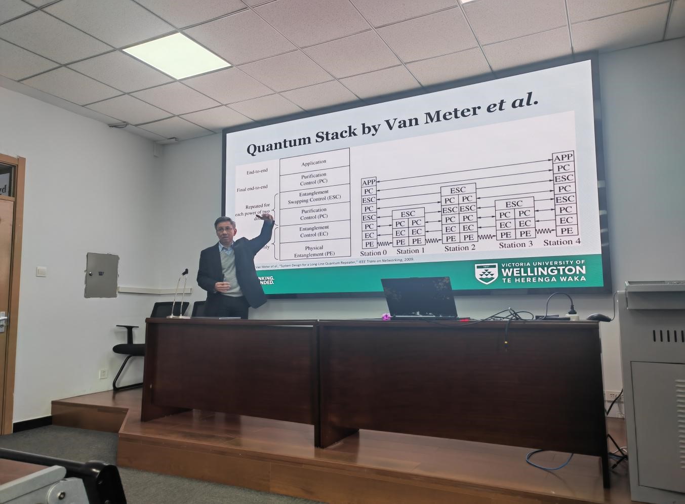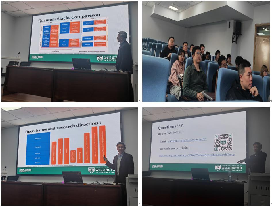 2023年4月26日下午,应太阳集团tyc5997邀请,新西兰惠灵顿维多利亚大学工程和计算机科学学院Seah Khoon Guan教授在太阳集团tyc5997一楼多媒体报告厅(119室)为我院师生作题为“量子网络”的学术讲座。本场讲座由太阳集团tyc5997李乌云格日乐副教授主持,副院长黄宝琦教授、李华教授、贾冰副教授、许岗副教授及无线网络相关方向教师、研究生和本科生现场聆听了本次讲座。