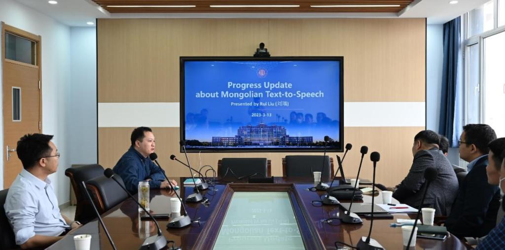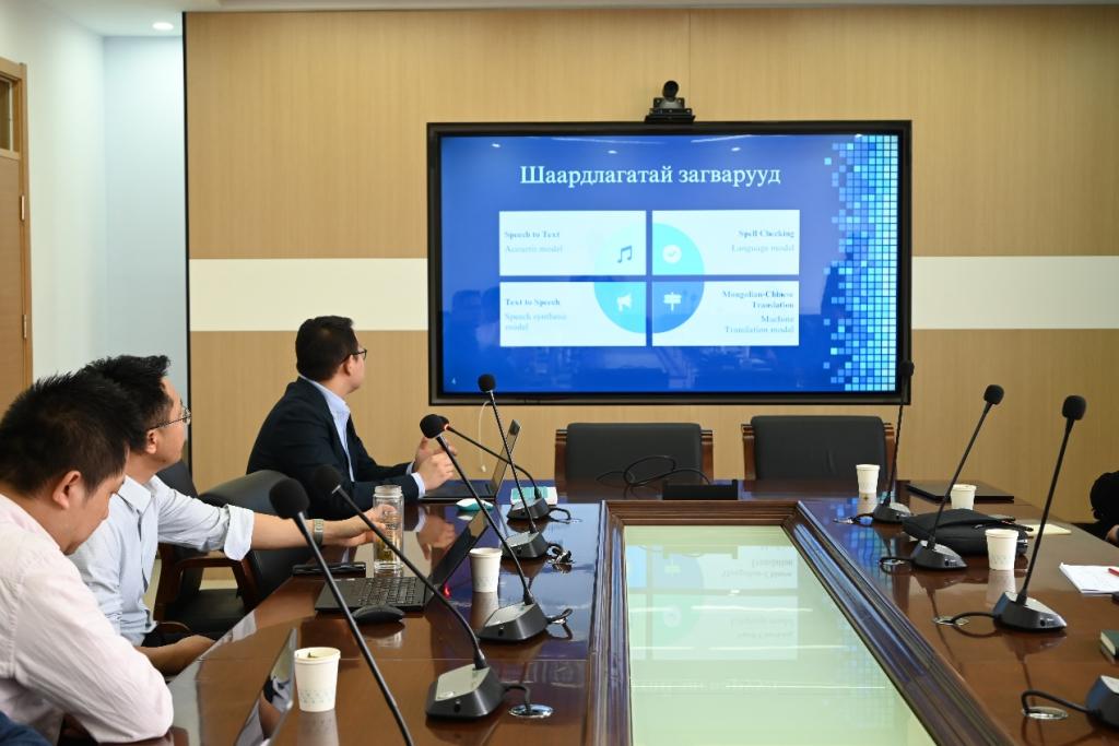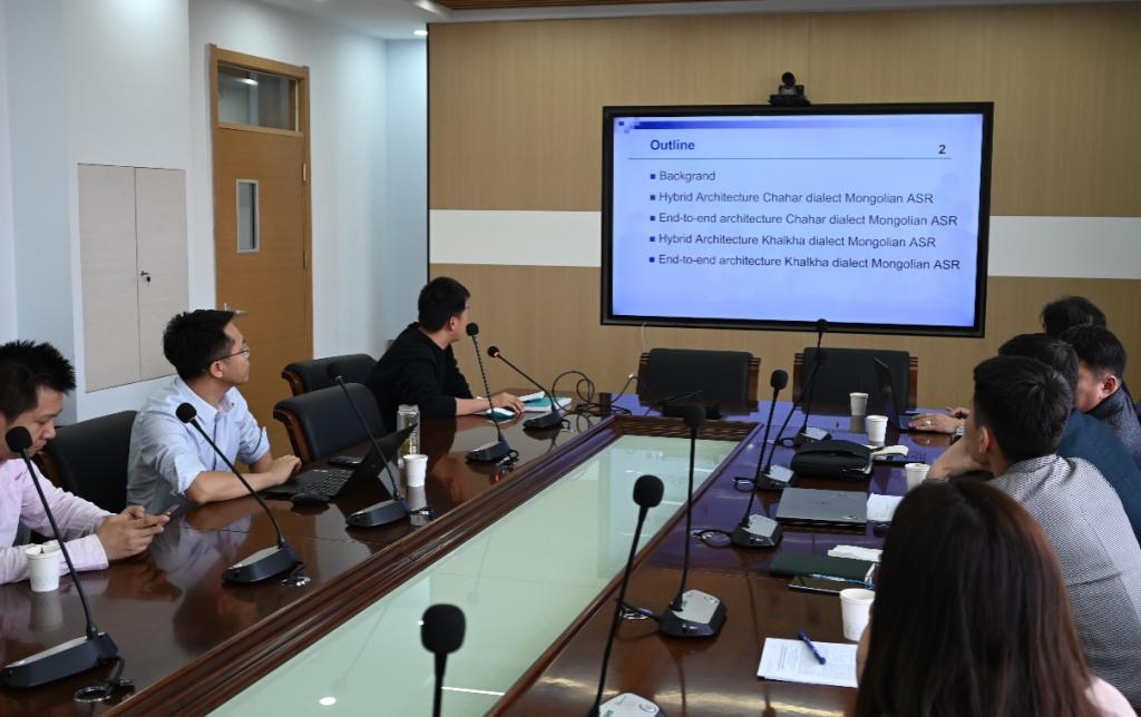本次会议就双方合作交流情况、相关进展以及蒙古语智能信息处理最新研究技术等进行了探讨。会上,飞龙教授首先对项目建设期间取得的重要研究成果进行了详细汇报。境外合作方蒙古国科学院数学与数字技术研究所所长奥干巴特尔教授对项目在建设期间取得的资源建立和研究成果进行了汇报。项目组成员张晖副教授、刘瑞研究员、王勇和博士就蒙古文OCR关键技术及应用、蒙古语语音合成最新技术、蒙古语语音识别最新技术进行了技术分享。蒙古国科学院数学与数字技术研究所苏德贾木斯博士生、达瓦苏荣博士生就蒙古语语音信息处理、图像文字识别进行了技术分享。