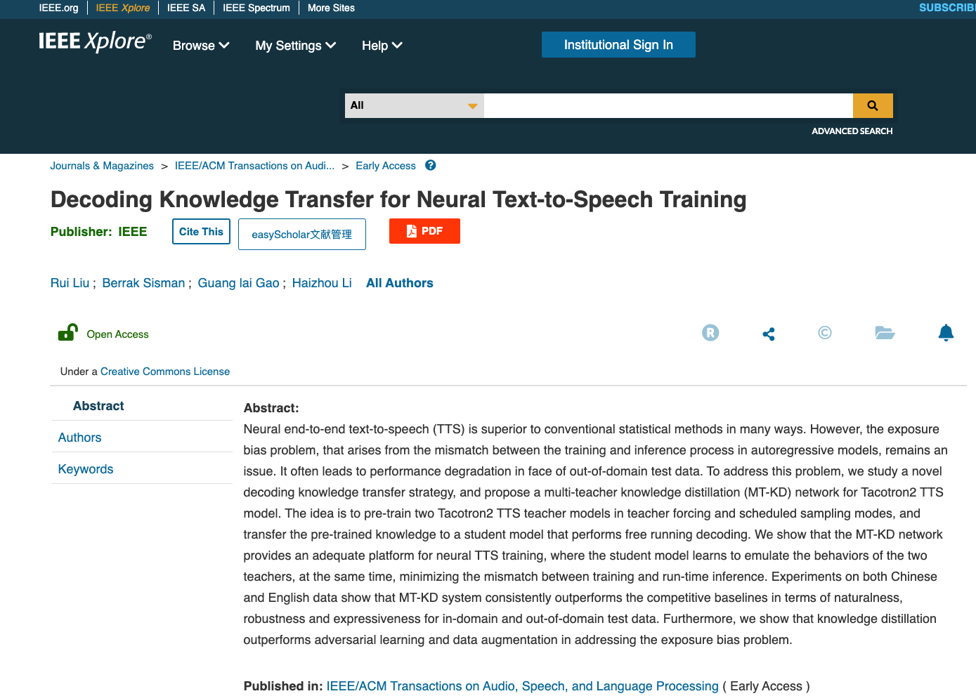 近日,我校蒙古文智能信息处理技术国家地方联合工程研究中心(蒙古文信息处理技术自治区重点实验室)与香港中文大学李海洲教授团队合作在国际信号处理领域TOP期刊《IEEE/ACM Transactions on Audio, Speech, and Language Processing》上发表了题为“Decoding Knowledge Transfer for Neural Text-to-Speech Training”的研究论文(DOI:10.1109/TASLP.2022.3171974)。《IEEE/ACM Transactions on Audio, Speech, and Language Processing》期刊是是音频、声学、语言信号处理的顶级期刊,在中科院SCI期刊分区为一区TOP期刊,清华最新版计算机学术推荐列表中认定为A类刊物,影响因子3.919。