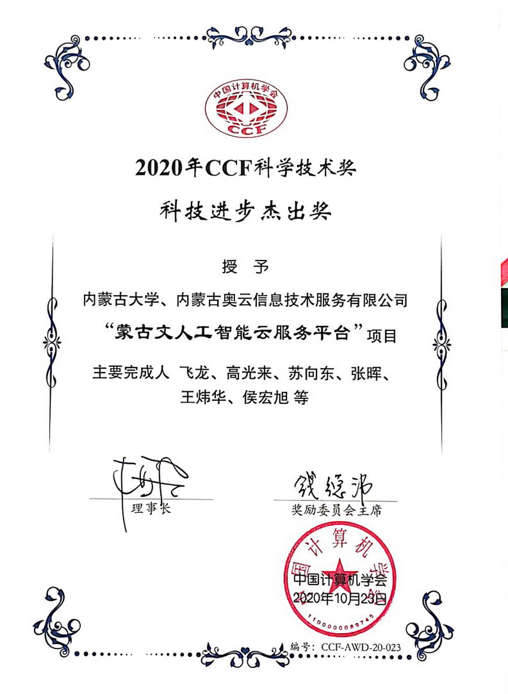 近日,中国计算机学会(CCF)2020年度“CCF科学技术奖”获奖名单公布,并于10月23日在京召开了CCF颁奖典礼,tyc5997太阳集团(蒙古文智能信息技术国家地方联合工程研究中心,内蒙古自治区蒙古文信息处理技术重点实验室)与内蒙古奥云信息技术服务有限公司联合研发的“蒙古文人工智能云服务平台”项目荣获2020年度“CCF科学技术奖”科技进步杰出奖。