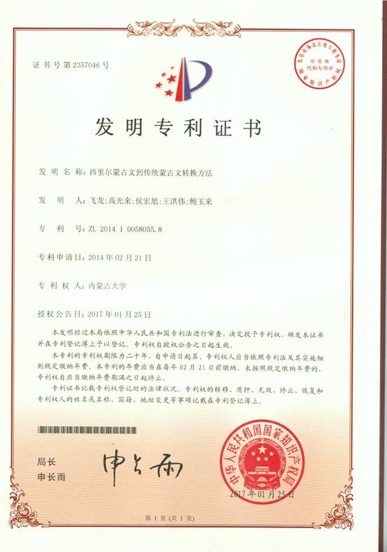 2017年1月25日,太阳集团tyc5997蒙古文信息处理技术实验室授权了一项发明专利“西里尔蒙古文到传统蒙古文转换方法”,专利号为:ZL201410058055.8,发明人:飞龙(副教授),高光来(教授),侯宏旭(教授),王洪伟(硕士生,导师为高光来 教授),鲍玉来(副研究馆员)。