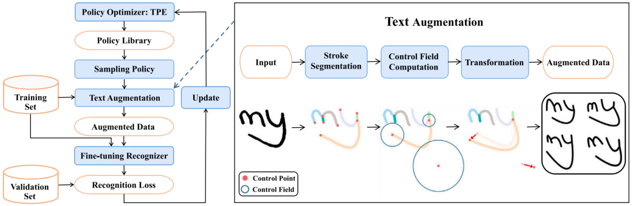 为了解决这些问题,该工作提出了用于手写体字符识别的细粒度自动增广框架。该框架将每个单词样本视为由多个笔画组成,并通过对笔画执行细粒度转换来实现数据增广。每个单词被自动分割成不同的笔画,每个笔画都用一个贝塞尔曲线拟合。在此基础上,我们定义了与细粒度变换相关的增广策略,并使用贝叶斯优化来自动选择最优的增广策略,从而实现了手写样本的自动增广。在7种不同语言的手写数据集上的实验表明,该框架对比基线对手写字符识别具有最佳的增广效果。