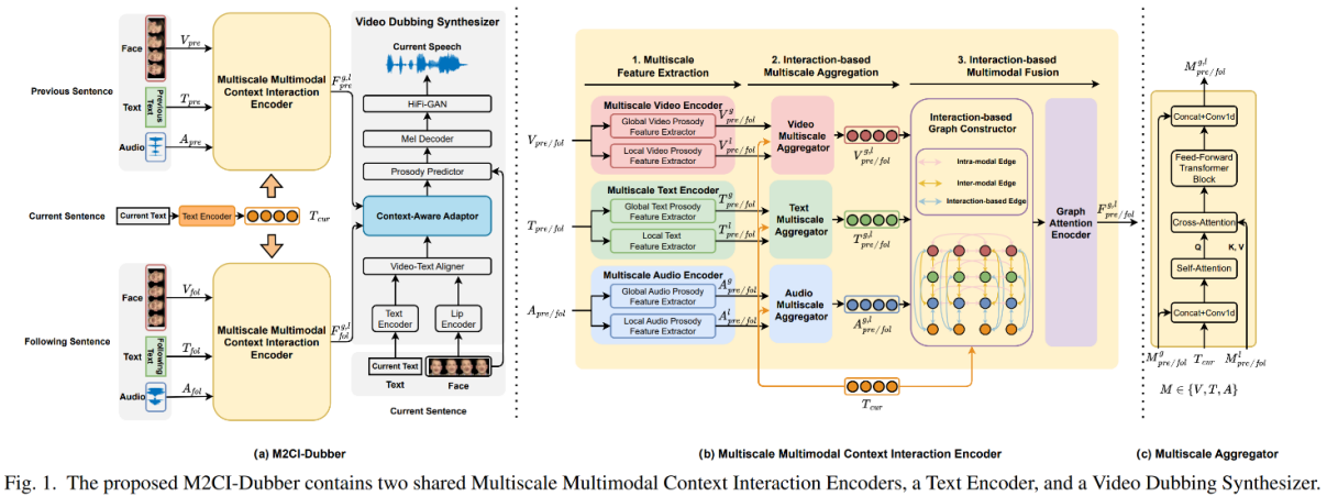 摘要:自动视频配音(Automatic Video Dubbing,AVD)从脚本中生成与嘴唇运动和面部情绪对齐的语音。最近的研究关注建模多模态上下文以增强韵律表达,但忽略了两个关键问题:1)上下文中的多尺度韵律表达属性影响当前句子的韵律。2)上下文中的韵律线索与当前句子互动,影响最终的韵律表达。为了解决这些挑战,我们提出了M2CI-Dubber,一种用于AVD的多尺度多模态上下文交互方案。该方案包括两个共享的M2CI编码器,用于建模多尺度多模态上下文并促进其与当前句子的深度交互。通过为上下文中的每种模态提取全局和局部特征,利用基于注意力机制的聚合和交互,并采用基于交互的图注意力网络进行融合,所提出的方法增强了合成语音的韵律表达,使其更适合当前句子。对Chem数据集上的实验证明,我们的模型在配音表现方面优于基线模型。