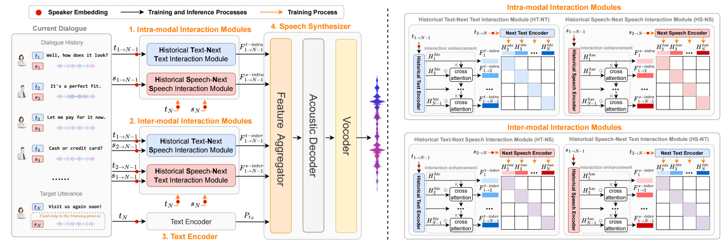 摘要:对话式语音合成(Conversational Speech Synthesis,CSS)旨在有效地利用多模态对话历史(Multimodal Dialogue History,MDH)生成具有适当会话语境的目标话语。CSS的关键挑战在于对MDH和目标话语之间的交互进行建模。需要注意的是,在MDH中,文本和语音模态具有独特的跨模态影响,同时它们又相互补充以对目标话语的表达产生综合影响。先前的研究没有显式建模这种模态内部和模态间的交互。为了解决这个问题,我们提出了一种基于新的模态内和模态间上下文交互方案的CSS系统,称为I3-CSS。具体来说,在训练阶段,我们将MDH与目标话语中的文本和语音模态相结合,得到四种模态组合,包括“历史文本-下一个文本”,“历史语音-下一个语音”,“历史文本-下一个语音”和“历史语音-下一个文本”。然后,我们设计了两个基于对比学习的模态内交互和两个模态间交互模块,以深入学习模态内和模态间的上下文交互。在推理阶段,我们使用MDH并采用训练好的交互模块来充分推断目标话语文本内容的语音韵律。在DailyTalk数据集上进行的主观和客观实验表明,I3-CSS在韵律表达方面优于先进的基线模型。