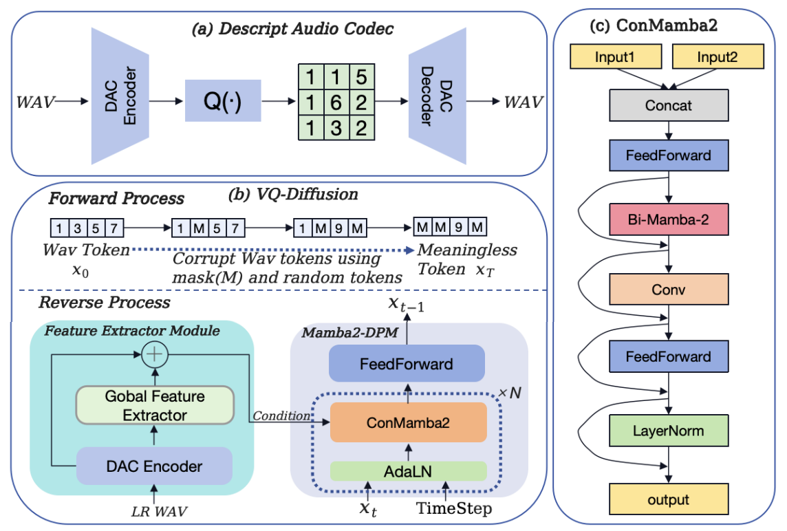 摘要:神经网络音频编解码器的最新进展为音频信号处理解锁了新的潜力。研究越来越多地探讨如何利用神经网络音频编解码器的潜在特征来完成各种语音信号处理任务。本文首次提出了一种基于神经网络音频编解码器离散特征的语音带宽扩展方法。通过在高度压缩的离散编码中恢复高频细节,该方法显著增强了语音的可懂度和自然度。基于向量量化扩散模型,所提出的框架结合了先进的神经网络音频编解码器、扩散模型以及Mamba-2的优势,重建语音高频成分。大量实验表明,该方法在对数频谱距离和ViSQOL指标上均表现出卓越的性能,显著提升了语音质量。