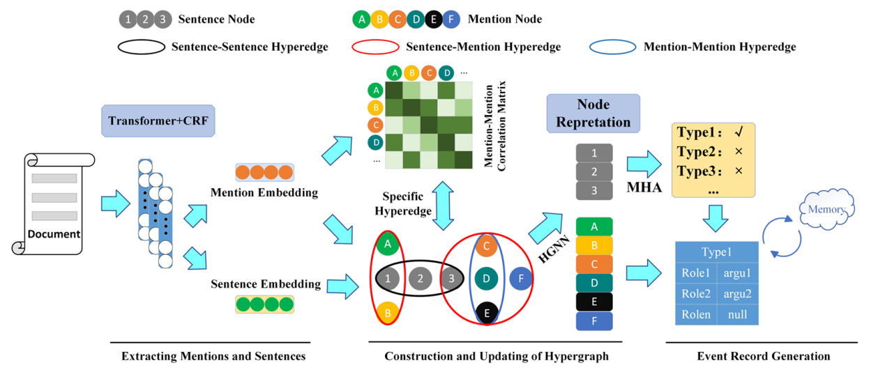 摘要:文档级事件提取(DEE)旨在识别给定文档中的事件信息。此任务的两个挑战是分散在不同句子中的事件论元和单文档中存在多事件。在本文中,我们提出了一种新的动态超图模型来解决传统图中全局建模能力有限的问题。首先,我们构建一个超图来建模文档中不同句子和实体之间的全局交互。然后,通过基于更新的节点表示构建提及-提及相关矩阵来生成新的超边,从而使超图具备动态结构。此方法允许根据上下文更新节点的语义。最后,广泛的实验和分析表明,我们的方法在应对上述两个挑战中取得了显著改进,并在两个公开数据集上的表现优于现有的最先进模型。