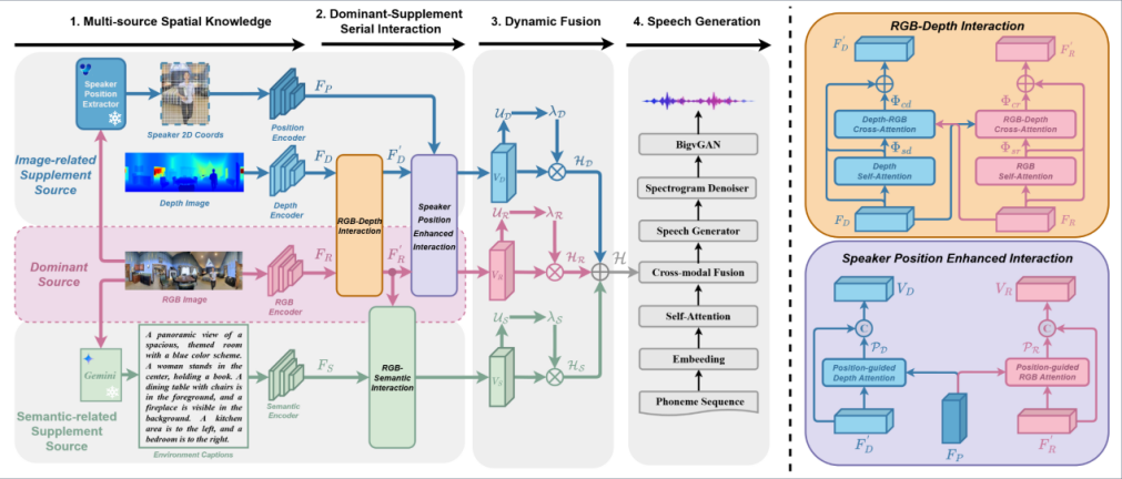 摘要:视觉文本转语音 (VTTS) 旨在利用环境图像作为提示,来合成具有真实环境混响效果的语音内容。以往的研究主要局限于使用 RGB 图像进行全局环境建模,未能充分利用深度信息、说话者位置以及环境语义等多维度空间信息。针对这一问题,我们提出了一种创新的多源空间知识理解方案,用于提升沉浸式 VTTS 效果,命名为 MS²KU-VTTS。在该方案中,我们将 RGB 图像设定为主要信息源,同时引入深度图像、基于目标检测的说话者位置信息以及由 Gemini 生成的场景语义描述作为辅助信息源。我们设计了一种串行交互机制,实现主要信息源与辅助信息源的有效融合。系统会根据各个信息源的重要程度,动态整合多源知识。这种多源空间知识的深度交互与融合为语音生成模型提供了更全面的指导,显著提升了语音的沉浸感。实验结果证实,MS²KU-VTTS 在生成沉浸式语音方面的表现优于现有方法。