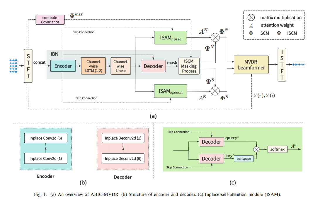 摘要:多通道语音增强使用多个捕获空间线索的麦克风来提取语音,对于视频会议系统、远程通信和助听器等应用至关重要。最小方差无失真响应(MVDR)是一种经典的自适应波束形成器,理论上可以确保信号在目标方向上无失真传输,这使得它在实际应用中很受欢迎。MVDR的降噪性能实际上取决于噪声和语音空间协方差矩阵(SCM)估计的准确性。然而,大多数基于掩模的波束形成方法通常假设源是静止的,忽略了移动源的情况,这会导致性能下降。在本文中,我们提出了一种基于注意力机制计算语音和噪声SCM的方法,再应用MVDR来获得增强后的语音。为了充分利用空间信息,我们应用了原地卷积算子和频率无关的LSTM来改进对SCM估计。实验表明,在各种条件下,我们所提出的方法在计算量减少、参数减少的情况下优于其他基线。