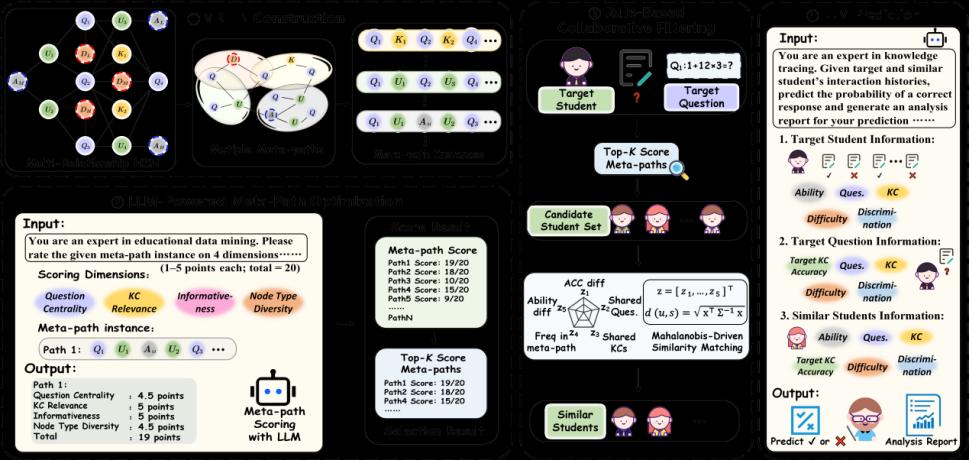 论文题目:HISE-KT: Synergizing Heterogeneous Information Networks and LLMs for Explainable Knowledge Tracing with Meta-Path Optimization 作者:段智议(tyc5997太阳集团研究员),史子星(tyc5997太阳集团2024级硕士研究生),袁宏宇(tyc5997太阳集团2025级博士研究生),王琪(吉林大学副教授) 论文简介:知识追踪(KT)旨在挖掘学生知识状态的演变轨迹,并预测其未来的问题回答表现。然而,现有基于异构信息网络(HINs)的方法容易因元路径的手动或随机选择而引入噪声,且缺乏对元路径实例的必要质量评估。同时,基于大型语言模型(LLMs)的方法则忽视了跨学生的丰富信息,两种范式都难以持续提供准确且基于证据的解释。为解决这些问题,本文提出了一种创新的HIN-LLM协同增强的知识追踪框架(HISE-KT),该框架实现了HINs与LLMs的无缝整合。HISE-KT首先构建包含多种节点类型的多关系HIN,通过多条元路径捕捉结构化关联。随后运用LLM智能评分和筛选元路径实例,保留高质量路径,开创了元路径质量自动评估的先河。受教育心理学原理启发,本文设计了基于元路径的学生检索机制,为预测提供更有价值的上下文信息。针对四个公开数据集的实验表明,HISE-KT在预测性能和可解释性方面均优于现有KT基线模型。本文的研究通过将HINs与LLMs协同融合,为发展透明、自适应的教育人工智能建立了新范式。 |