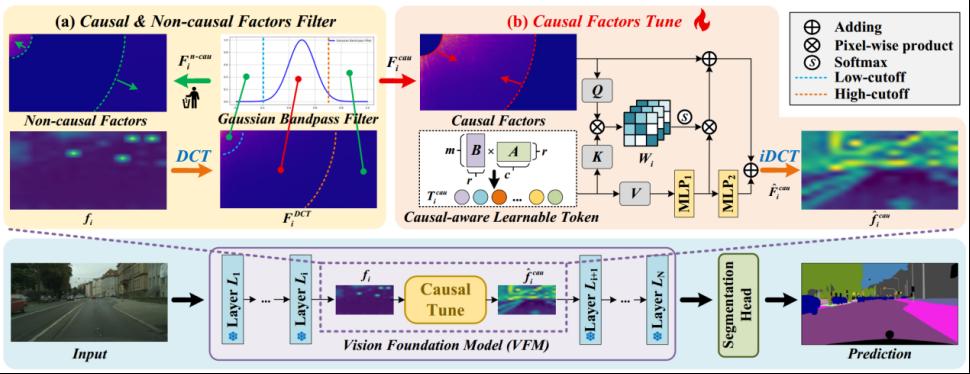 论文题目:Causal-Tune: Mining Causal Factors from Vision Foundation Models for Domain Generalized Semantic Segmentation 作者:张印(哈尔滨工业大学21级博士生),张永强(tyc5997太阳集团 研究员),郑尧月(西安交通大学21级博士生),Bogdan Raducanu(巴塞罗那自治大学),刘丹(哈尔滨工业大学) 单位:哈尔滨工业大学仪器科学与工程学院,巴塞罗那自治大学计算机视觉中心,太阳集团tyc5997 论文简介:在域泛化语义分割(Domain Generalized Semantic Segmentation, DGSS)任务中,仅微调视觉基础模型(Vision Foundation Models, VFMs)的少量参数就可以显著的提升DGSS的性能。现有的方法通常通过训练轻量级adapters或优化中间层特征来提升模型在未知域上的泛化能力。然而,这些方法往往忽视了一个关键问题:预训练的VFMs常常会产生特征伪影,这些伪影会阻碍VFMs中有价值feature的利用,从而削弱DGSS的性能。受因果机制的启发,本文发现这些伪影与非因果因素相关,而这些非因果因素通常存在于VFMs特征谱的低频和高频部分。本文针对DGSS任务,显式地分析了VFMs特征中的因果与非因果因素,并提出了一种简洁而高效的方法来识别并解耦二者,从而实现更稳健的域泛化。为此,本文提出了Causal-Tune——一种新颖的微调策略,旨在从VFMs特征中提取因果因素并抑制非因果因素。首先,本方法利用离散余弦变换(Discrete Cosine Transform, DCT)提取每一层特征的频谱;随后,采用高斯带通滤波器将频谱划分为因果与非因果部分。为了进一步优化因果部分,本方法在频域中引入了一组因果感知的可学习tokens来进行特征增强,而非因果部分则被丢弃。最后,将优化后的因果特征通过逆DCT转换回空间域,并输入下一层。本方法在大量跨域实验中验证了Causal-Tune的有效性,尤其在恶劣天气条件下表现突出,如雪天场景中相比基线方法mIoU提升了4.8%。 |