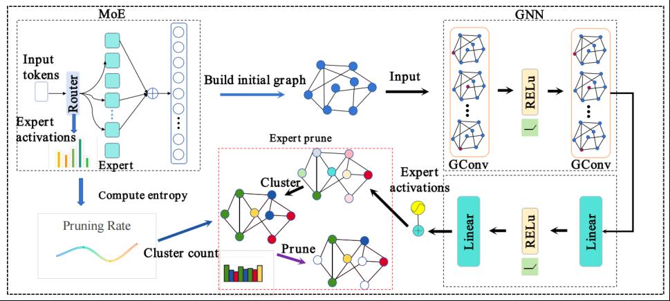 论文题目:C-GNN-PRUNE: A Unified Graph-Based Framework for Structure-Aware Pruning of Mixture-of-Experts Models 作者:李林(tyc5997太阳集团24级硕士研究生)、王燕(tyc5997太阳集团 副教授)(通讯作者)、王卓鹏(tyc5997太阳集团24级硕士研究生) 论文简介:稀疏专家混合(MoE)结构在扩展大型语言模型(LLMs)方面展现出卓越的计算效率,但其庞大的参数规模仍然制约了部署效率。现有剪枝方法多忽视专家间的结构依赖与层间异质性,导致剪枝后性能退化与结构破坏。针对上述问题,本文提出统一的结构感知剪枝框架 C-GNN-PRUNE,通过图神经网络(GNN)建模专家间的交互关系,实现基于结构的专家选择与压缩。该框架首先设计基于熵的层级剪枝分配策略,根据专家激活分布熵自适应分配剪枝预算;随后构建专家交互图,融合输出相似度与路由差异信息,经由两阶段GNN学习结构感知嵌入;再通过社区检测机制识别功能冗余的专家簇,并在簇内基于激活频率执行保留与裁剪,从而在稀疏性与表达力间取得平衡。在 DeepSeek-V2-Lite、Qwen1.5-MoE-A2.7B 与 Mixtral-8×7B 三个开源模型上的实验结果表明,C-GNN-PRUNE 在不同剪枝率下均能显著提升压缩后的模型性能稳定性与任务泛化能力。与 C-PRUNE、EEMoE、Wanda 等方法相比,本方法在平均任务精度上最高提升达 4.3 个百分点,在保持高压缩比的同时有效维持模型表达多样性。该研究为实现结构保持、低资源开销的 MoE 模型压缩提供了一种统一且可扩展的解决方案。 |
