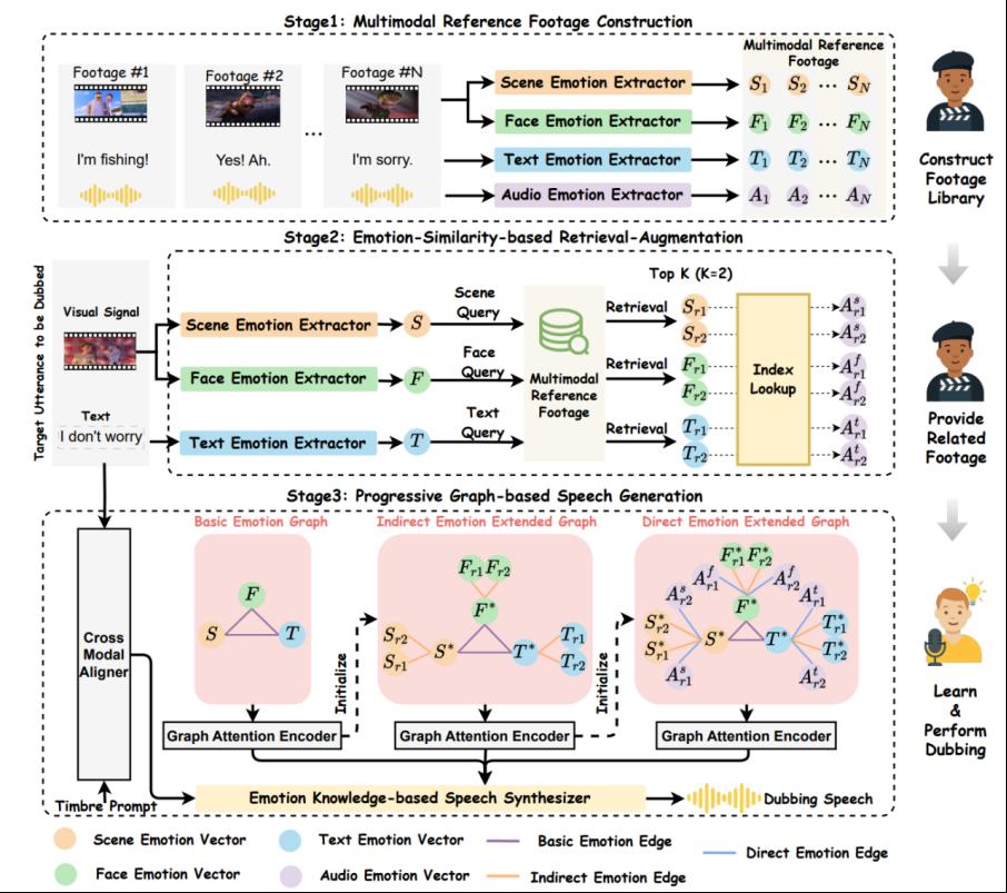 论文题目:Towards Authentic Movie Dubbing with Retrieve-Augmented Director-Actor Interaction Learning 作者:刘瑞(tyc5997太阳集团 教授)、赵源(tyc5997太阳集团25级博士研究生)、贾真琦(tyc5997太阳集团25级博士研究生) 论文简介:自动电影配音模型能根据给定剧本生成生动语音,通过简短的音色提示还原说话 人的音色,同时确保与无声视频的口型同步。现有方法模拟了演员直接配音且无需准备的简化流程,忽略了关键的导演- 演员互动环节。相比之下,真实配音流程涉及动态协作:导演会积极与演员沟通,引导他们在配音前内化语境线索,尤其是情感层面的线索。为解决这一问题,我们提出一种新的检索增强型导演 - 演员互动学习方案,以实现真实感电影配音,该方案被命名为Authentic-Dubber,包含三大创新机制:(1)构建多模态参考素材库,模拟导演提供的学习素材。通过整合大型语言模型(LLMs),实现对跨模态信号情感表征的深度理解。(2)提出基于情感相似度的检索增强策略,模拟演员在配音过程中高效、全面内化导演提供素材的过程。该策略会检索与目标无声视频最相关的多模态信息。(3)开发基于渐进式图结构的语音生成方法,逐步融入检索到的多模态情感知识,从而模拟演员的最终配音过程。上述机制使Authentic-Dubber 能够忠实复刻真实配音流程,在情感表现力上实现全面提升。在 V2C-Animation 基准数据集上的主观和客观评估均验证了该方案的有效性。 |