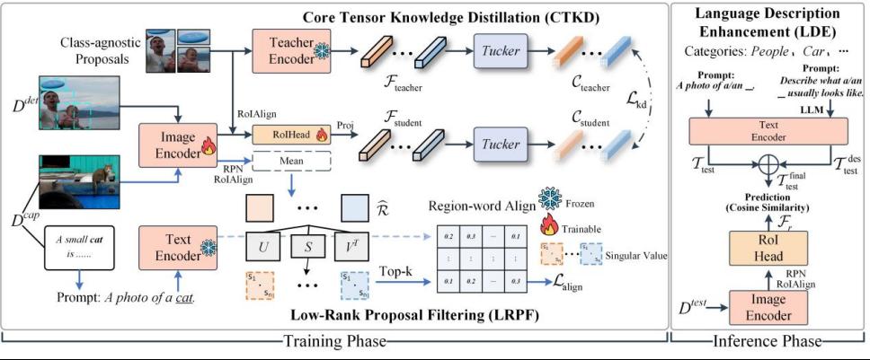 论文题目:Tensor Decomposition and Language Description for Open-Vocabulary Object Detection 作者:梁秋雨(tyc5997太阳集团24级博士研究生),张永强(tyc5997太阳集团)(通讯作者) 论文简介:开放词汇目标检测(Open-vocabulary Object Detection,OVOD)旨在突破固定类别限制,实现对未见目标的检测与识别。虽然现有研究基于区域-词语对齐(region-word alignment)和知识蒸馏(knowledge distillation)方面取得了进展,但其性能仍受三大问题制约:区域与词语对齐不精确、知识蒸馏存在冗余传递,以及类别嵌入表示质量较低。针对上述问题,本文提出了一种结合张量分解(Tensor decomposition)与语言描述(Language descriptions)的新颖的开放词汇目标检测框架,TLDet。在传统方法中,最高相似度得分的候选框常聚焦于判别性强但局部不完整的区域(如仅包含目标头部),导致区域-词语对齐偏差。为此,本文提出了低秩候选框筛选模块,通过奇异值分解计算候选框特征矩阵的奇异值之和,定量衡量其结构完整性,从而筛除判别性强但不完整的区域,显著提升视觉区域与文本语义之间的对齐精度。为避免知识蒸馏过程中的信息冗余,TLDet进一步引入核心张量蒸馏方法。该方法基于 Tucker 分解,将教师模型与学生模型的特征映射为核心张量,通过核心张量的优化对齐,实现高效且有选择性的知识迁移,使学生模型能够聚焦于教师模型中的关键特征表示。此外,为增强类别语义嵌入的表达能力,本文设计了语言描述增强机制。该机制在推理阶段引入大语言模型(LLM)的语义知识,通过生成丰富的类别语言描述,弥补开放词汇场景中长尾类别和模糊类别的语义缺失问题,从而提升类别嵌入的区分性与泛化能力。在 COCO 与 LVIS 主流开放词汇目标检测数据集上的实验结果表明,TLDet 在新类别检测任务中表现突出,分别取得 36.1% 的 mAP 和 30.1% 的 mask mAP,显著超越现有开放词汇检测方法,验证了其在开放世界视觉理解中的有效性与优越性能。 |