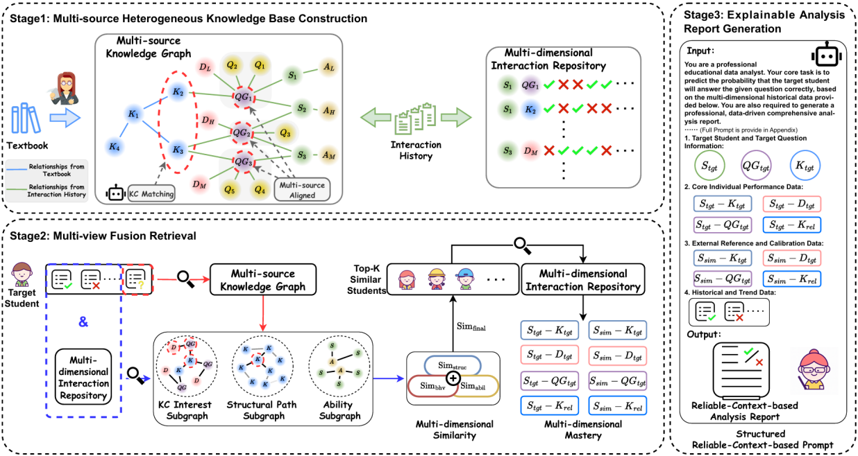 知识追踪(KT)旨在通过学生历史交互推断其知识状态,是个性化学习的关键技术。然而,传统深度学习方法依赖平台特定的标识符与隐式表征,难以迁移且缺乏可解释性;而基于大语言模型的提示或微调方法,要么因缺乏结构化约束而易产生幻觉,要么过度依赖单一数据分布,在真实教育场景中面对多平台、异源数据时泛化能力显著下降。为解决跨平台知识追踪面临的分布偏移与可解释性双重挑战,本文提出首个将检索增强生成范式应用于知识追踪的框架RAG-KT。RAG-KT构建多源异构知识库,通过问答组抽象层跨平台对齐语义等价问题,并设计多视图检索提取可靠上下文,驱动冻结的大语言模型进行零样本预测并生成可解释报告。在ASSIST09、ASSIST12、DBE-KT22及Eedi冷启动数据集上的大量实验表明,RAG-KT显著提升了预测准确率与鲁棒性,在跨平台和完全冷启动场景下均表现优异。同时,生成的解释性报告在可解释性、可读性、教育实用性和严谨性等维度上均优于现有方法,为教育数据挖掘提供了一种兼顾精度与可解释性的新范式。