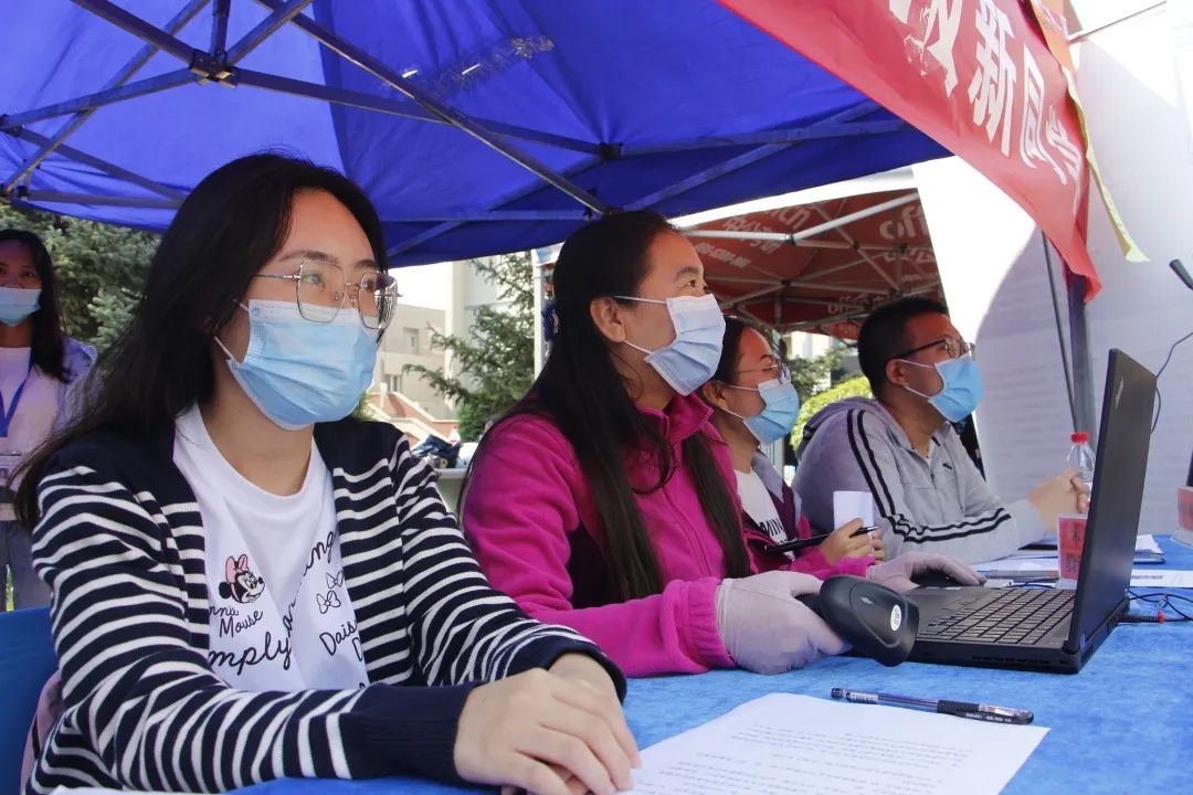 学院老师和学生志愿者在学院帐篷迎新点为新生办理入学手续,发放相关信息表和宿舍钥匙,并提供答疑服务
