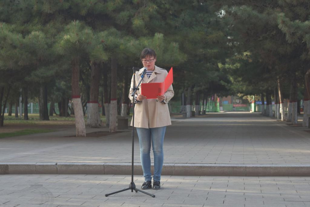 随着雄壮的国歌奏响,鲜艳的五星红旗冉冉升起,神圣庄严的氛围笼罩校园。在晨曦的微光中,五星红旗迎风飘扬,全体师生行注目礼、唱国歌。