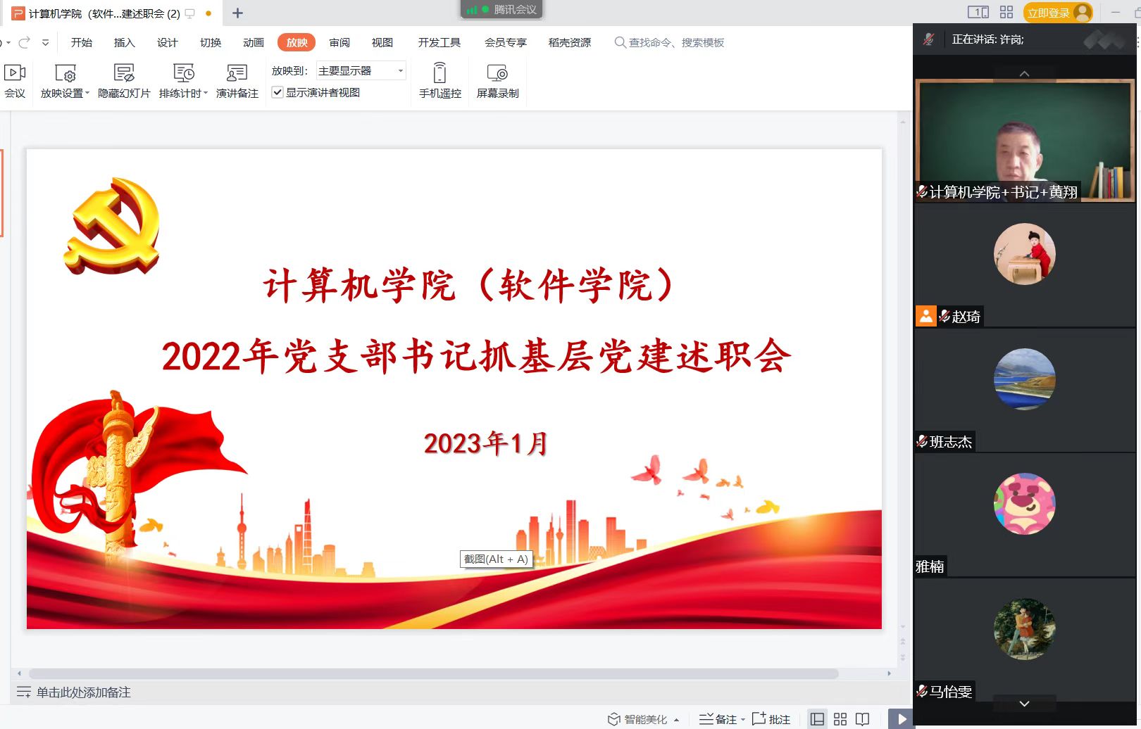 202315日下午3:00,学院党委采取线上方式召开2022年度党支部书记抓基层党建工作述职评议会,会议由学院党委书记黄翔主持。学院教工、研究生、本科生共7个党支部书记进行了年度党建工作述职和评议。各党支部委员会委员、教师和学生党员代表参加了会议。